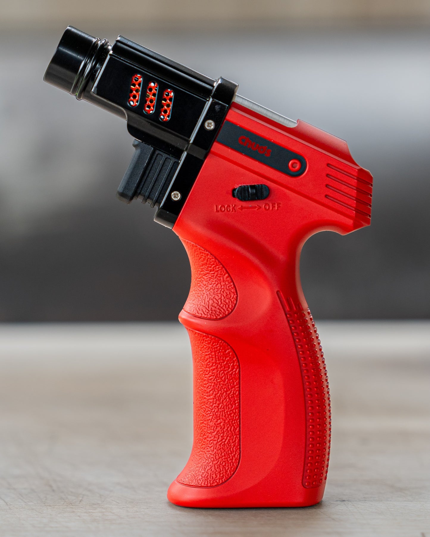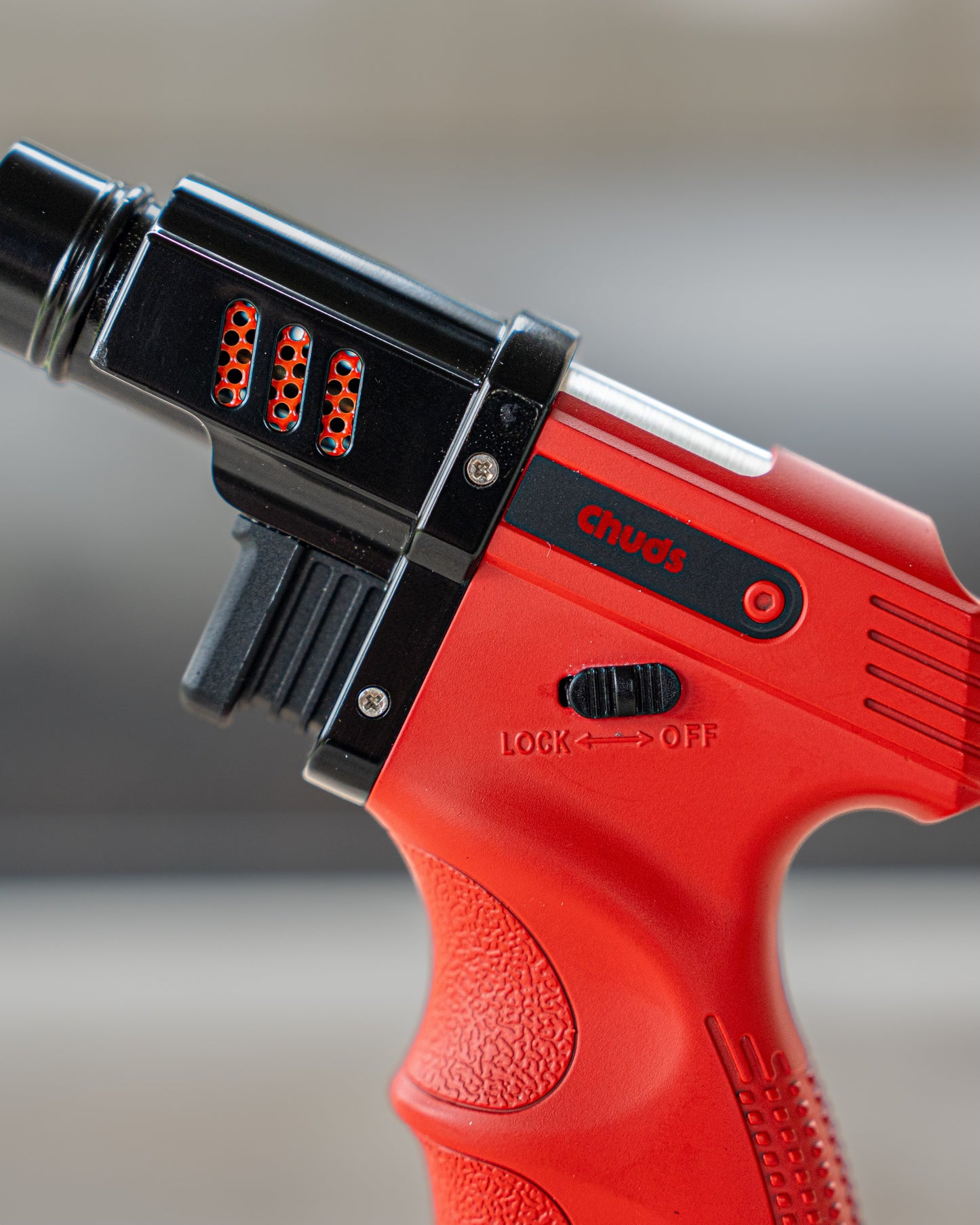 Chuds branded refillable butane torch lighter with adjustable flame, in a gift box. Perfect for quickly melting cheese on a burger, adding some extra sear on some meat, or starting a snake nest fire starter!