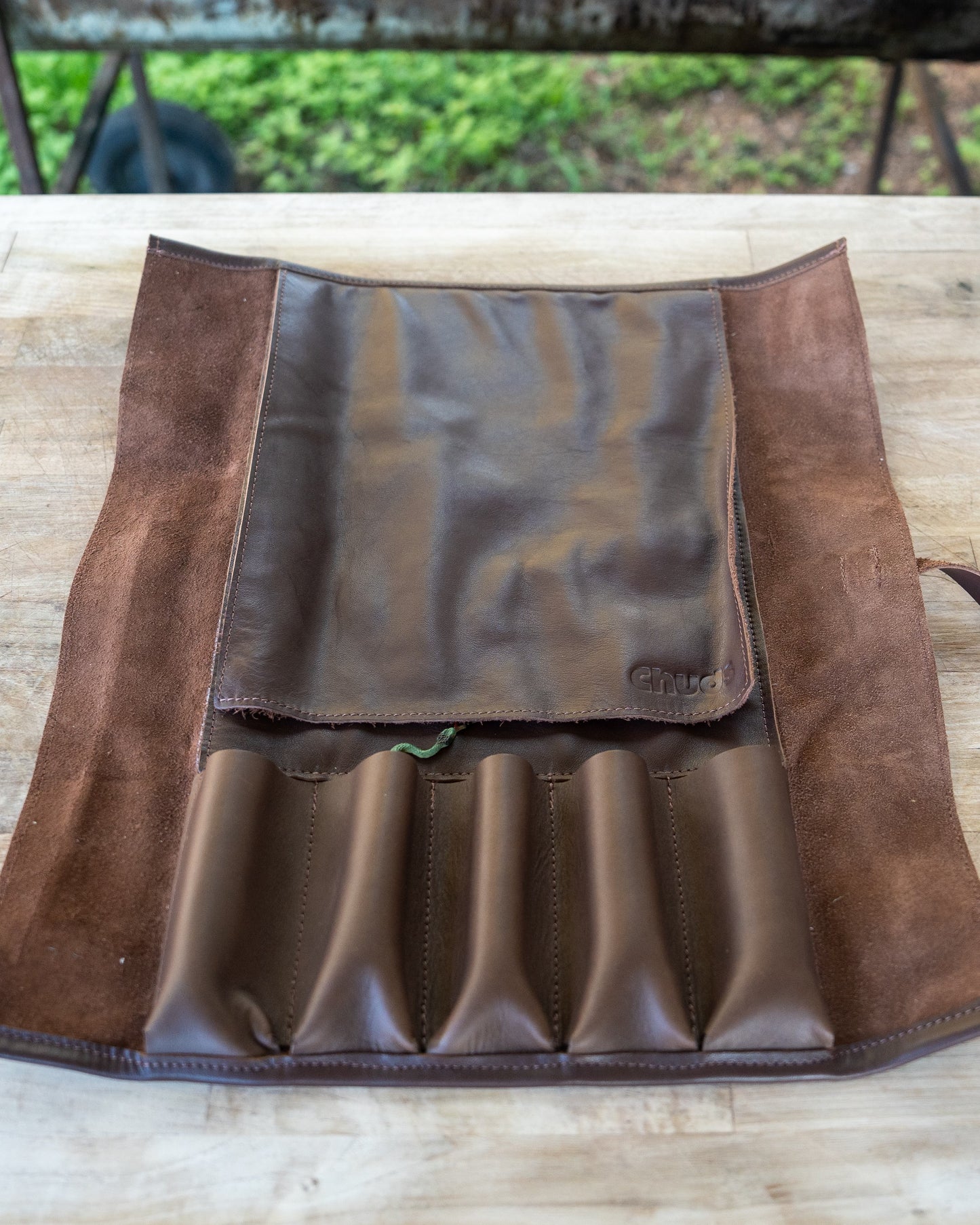 A double-layered center panel reinforces the roll to protect both the leather and your blades, while a safety flap stamped with the Chuds logo covers the knives when you open it up. Tough, dependable, and crafted to withstand being tossed, stacked, or hauled to any cookout—this is the knife roll built for pitmasters who put their gear to work.