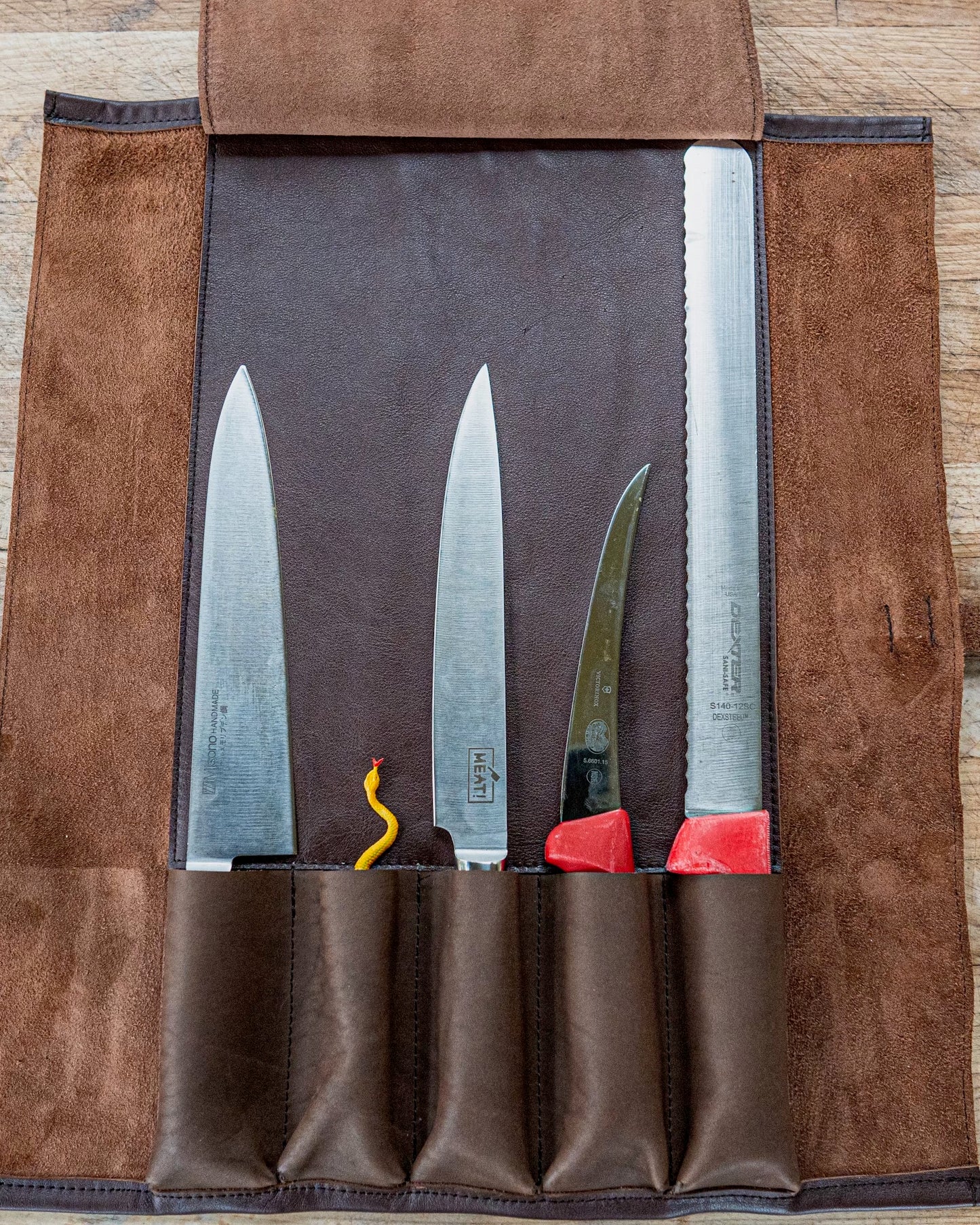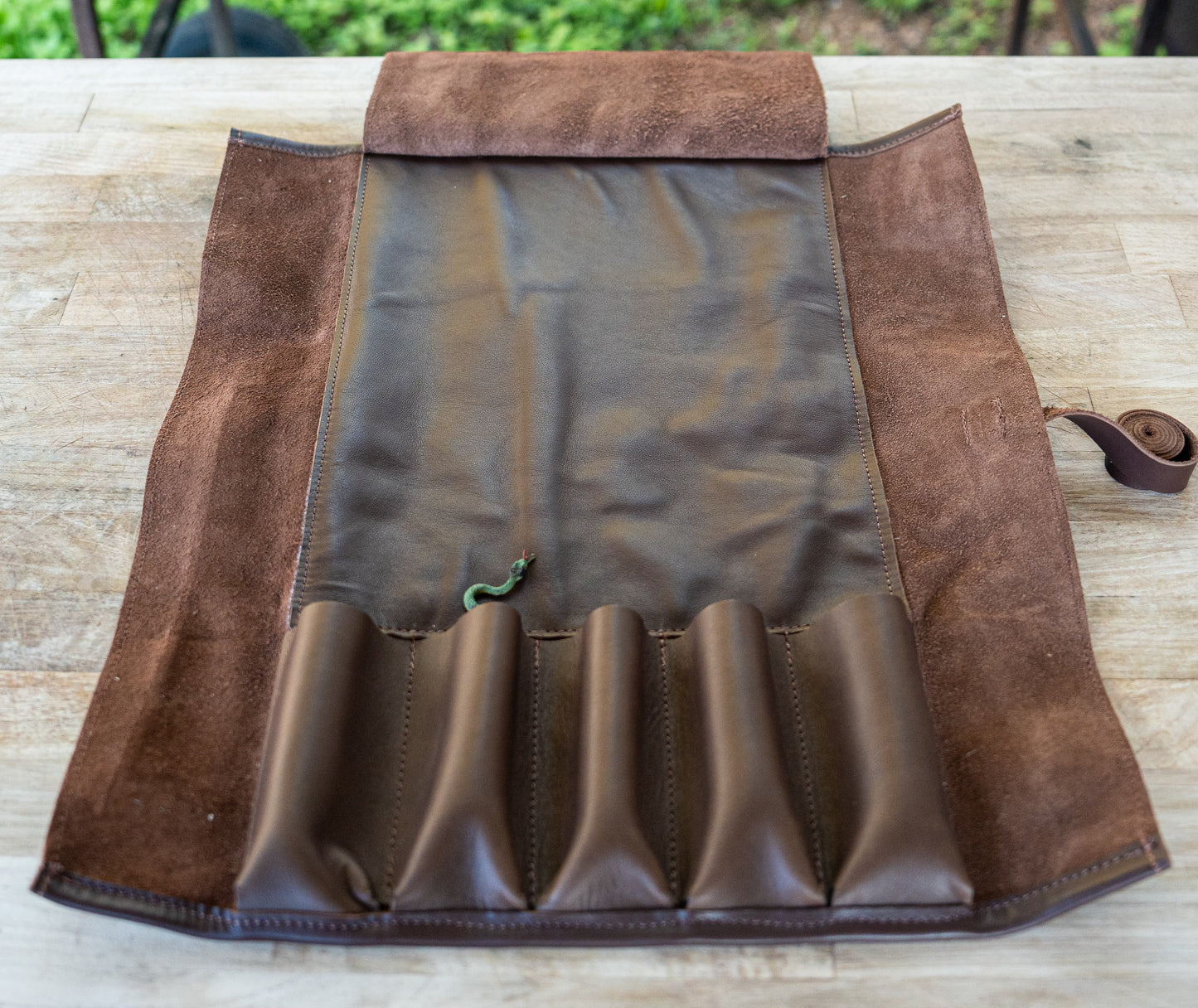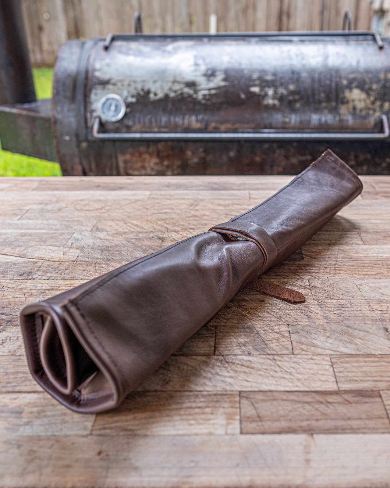 Handmade in small batches from premium leather, this knife roll is built specifically for the tools of a real barbecue cook. Unlike typical knife rolls, it’s designed around the essentials—especially your 12" slicer—so everything fits cleanly, securely, and without wasted space.