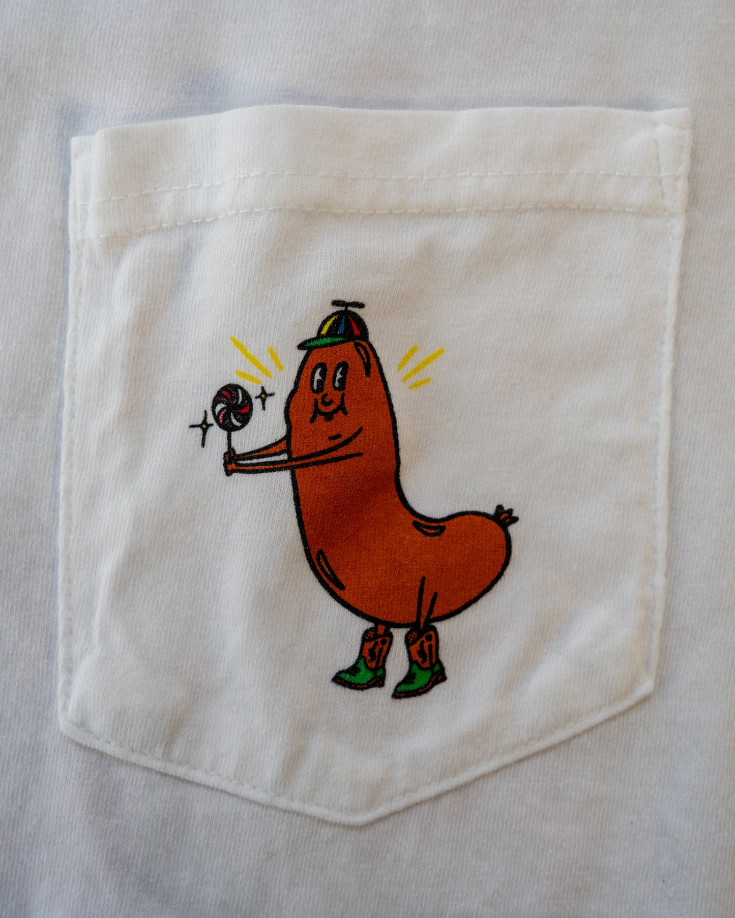 White t-shirt with a red cartoon character on a wooden surface