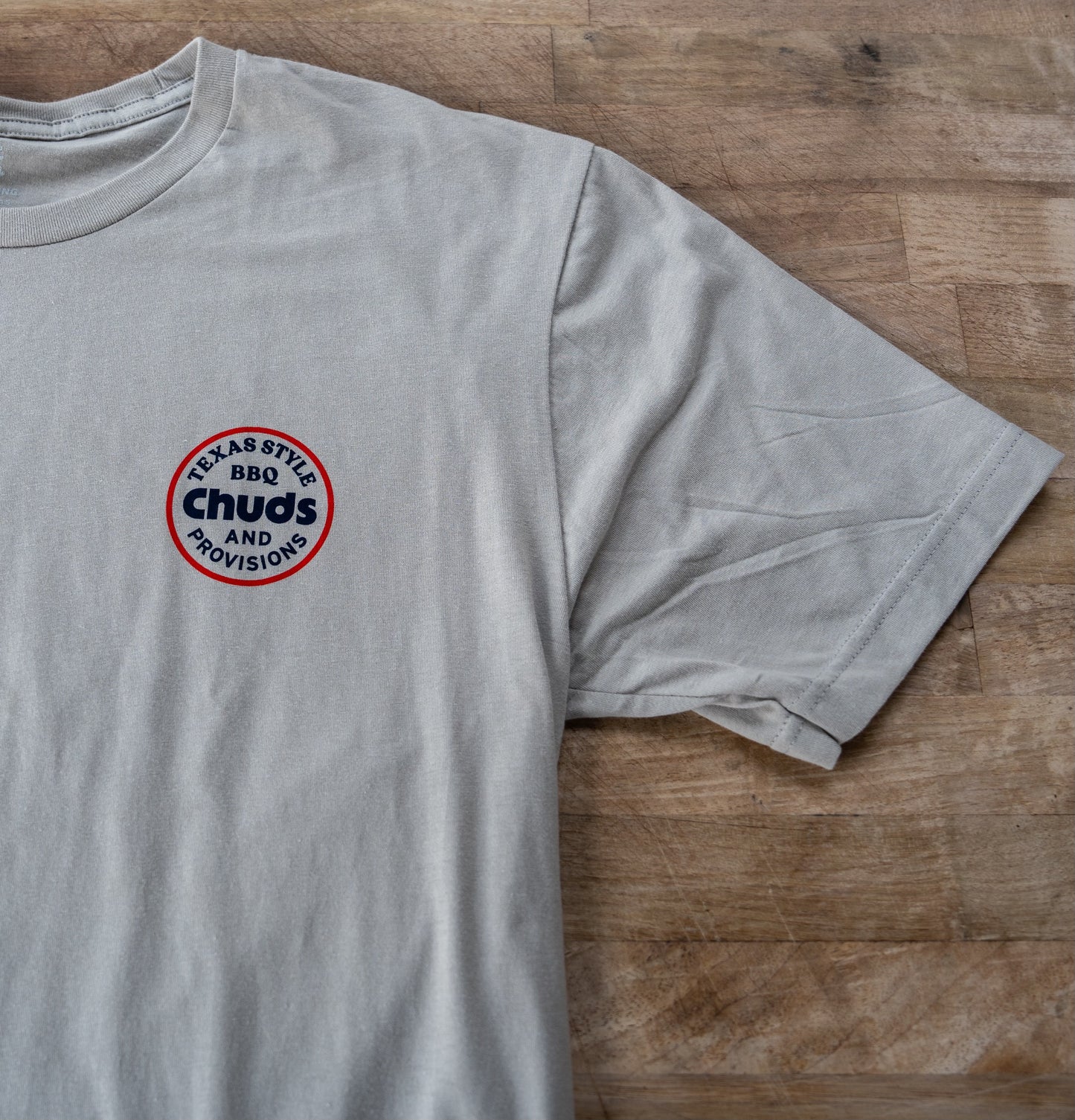 Show off your support of Chuds BBQ with this light gray, 100% cotton t-shirt with the Chuds Welder logo on the back.