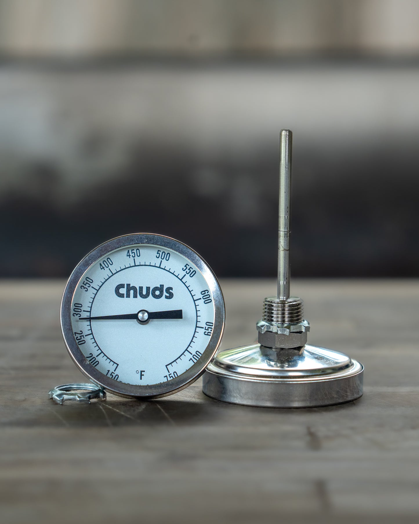 Tel-Tru BBQ Thermometer branded with the Chuds logo with a higher temperature range for more versatile cookers. These high-quality thermometers are what we install in our Chudbox and are now available for you to install in your very own direct heat cooker!