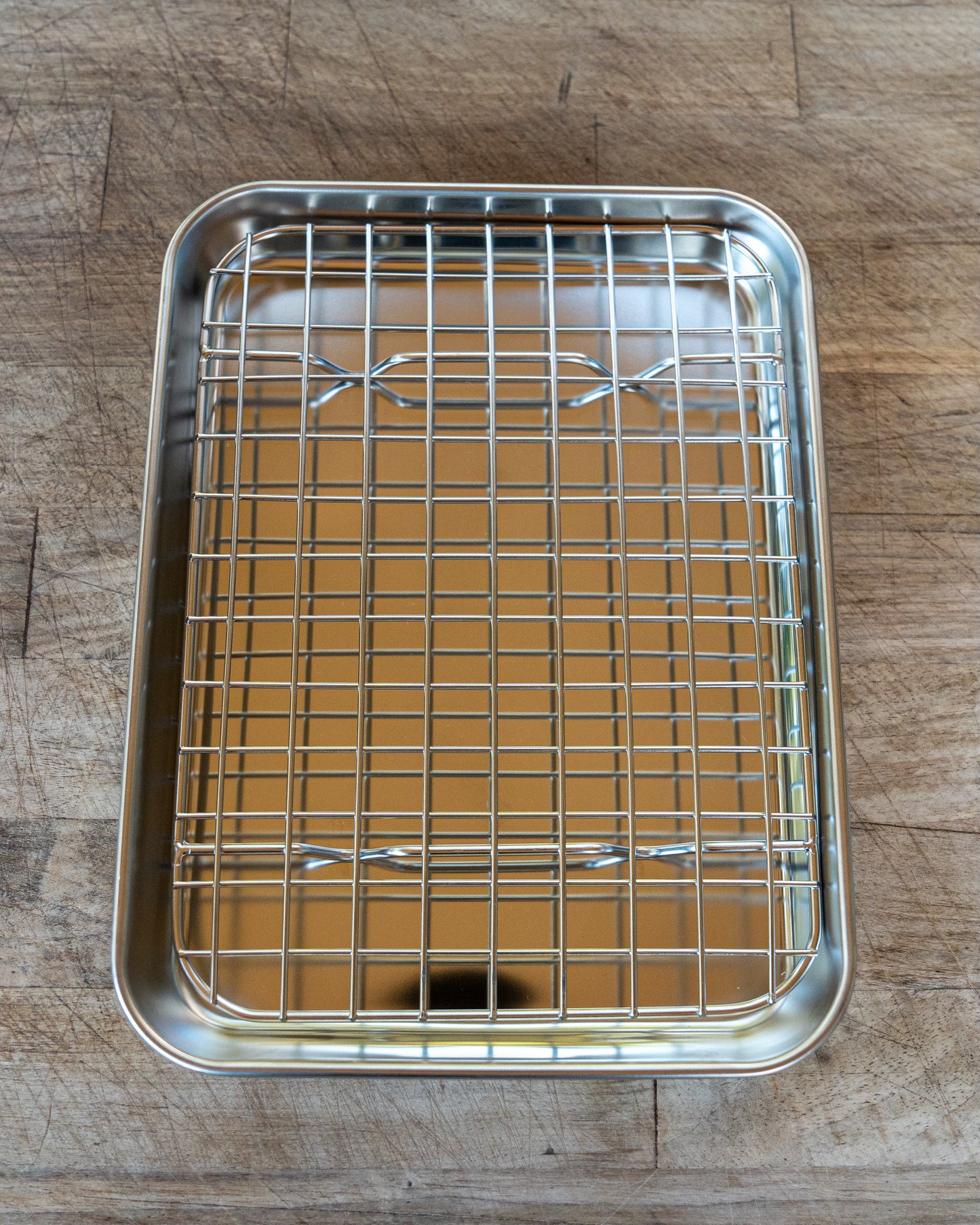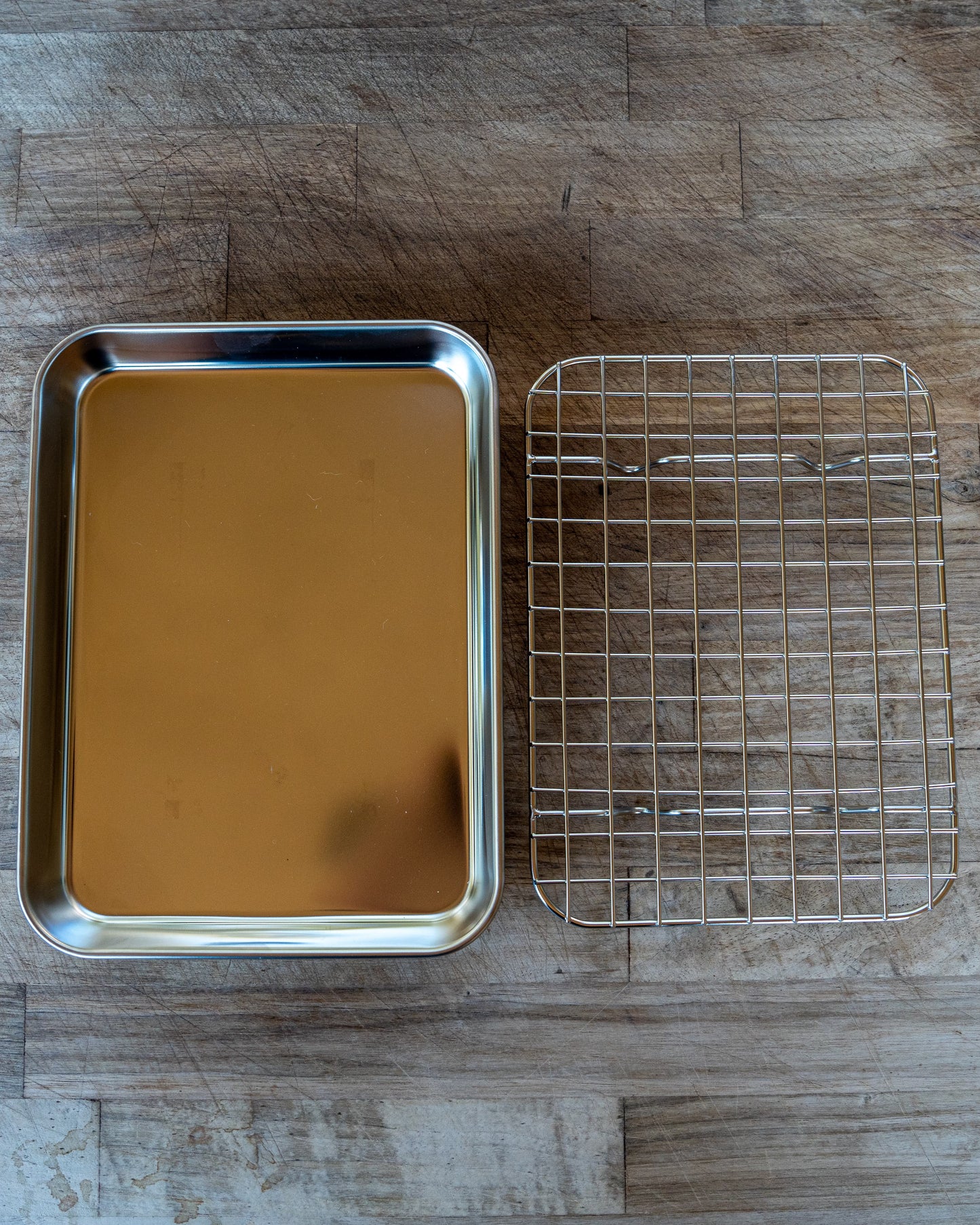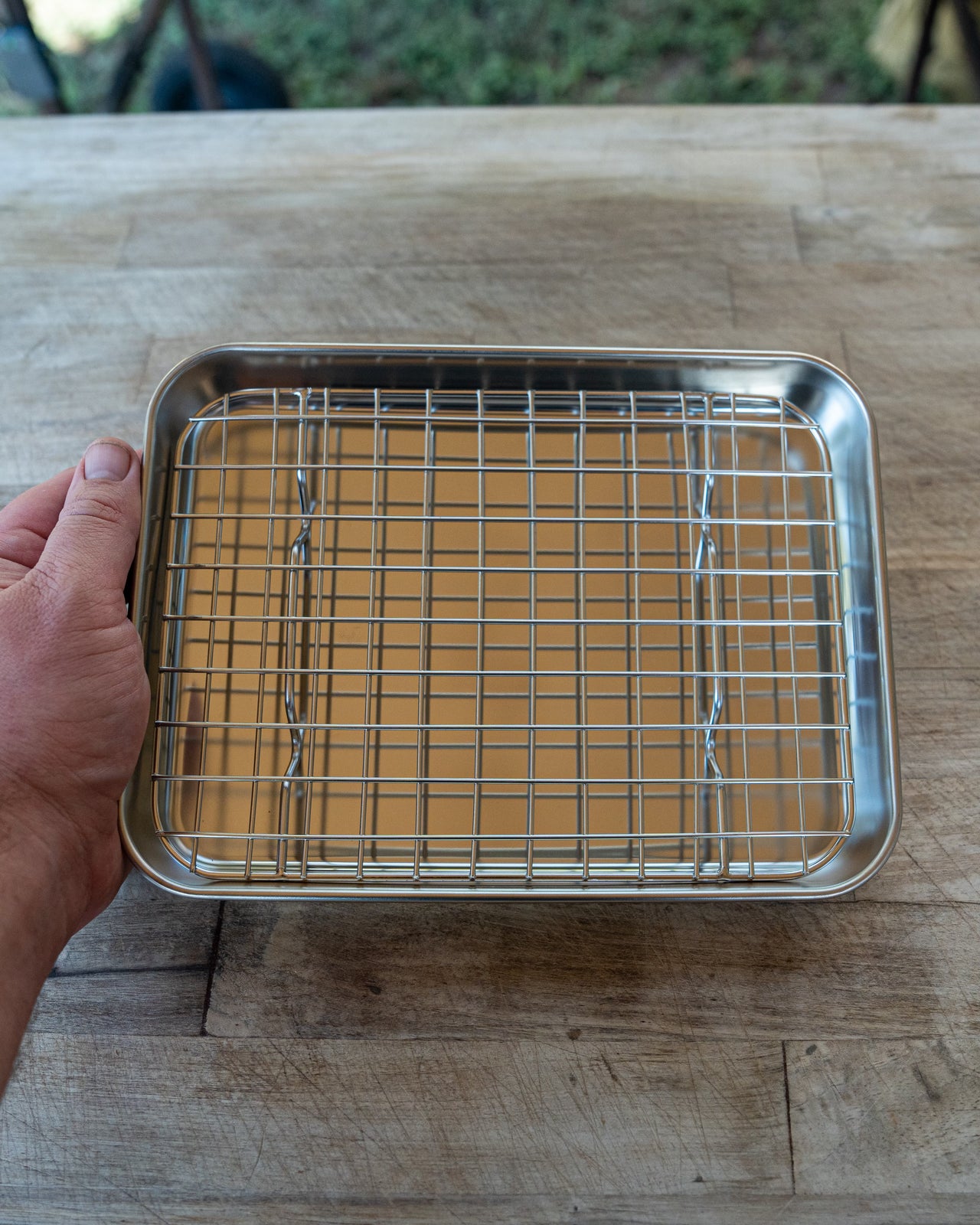 These stainless steel trays are ideal for dry-brining meat! 1/8 Size baking sheet and cooling rack, made of high quality 304 stainless steel without any chemical coating. It's high temperature and warp resistant, rust free, durable, long lasting and dishwasher safe.