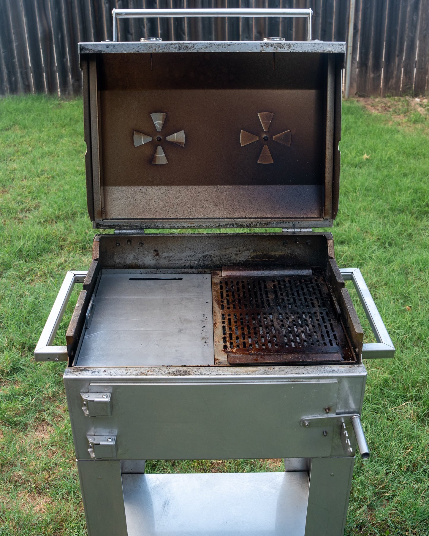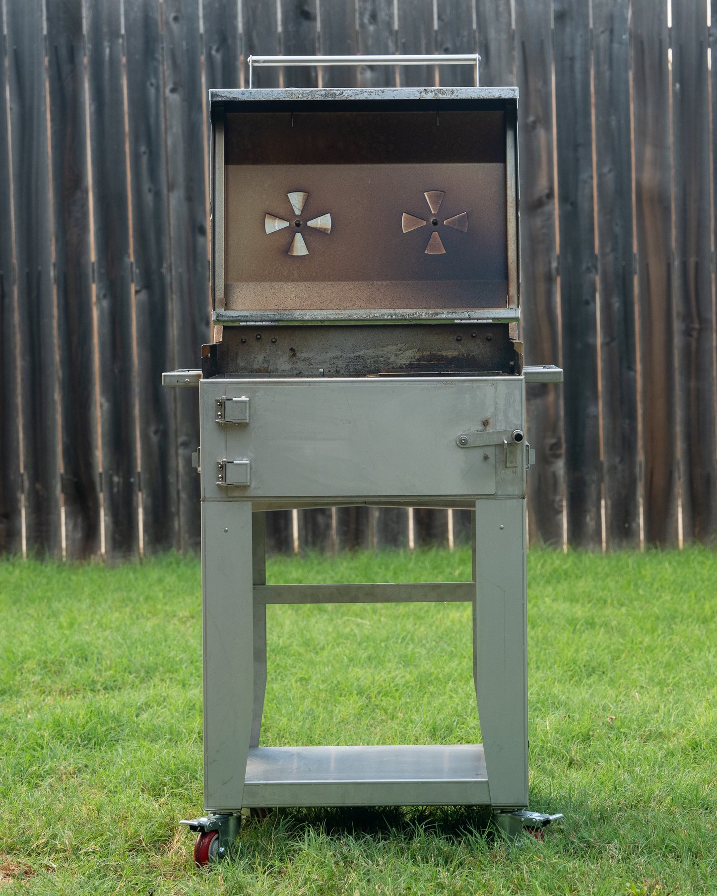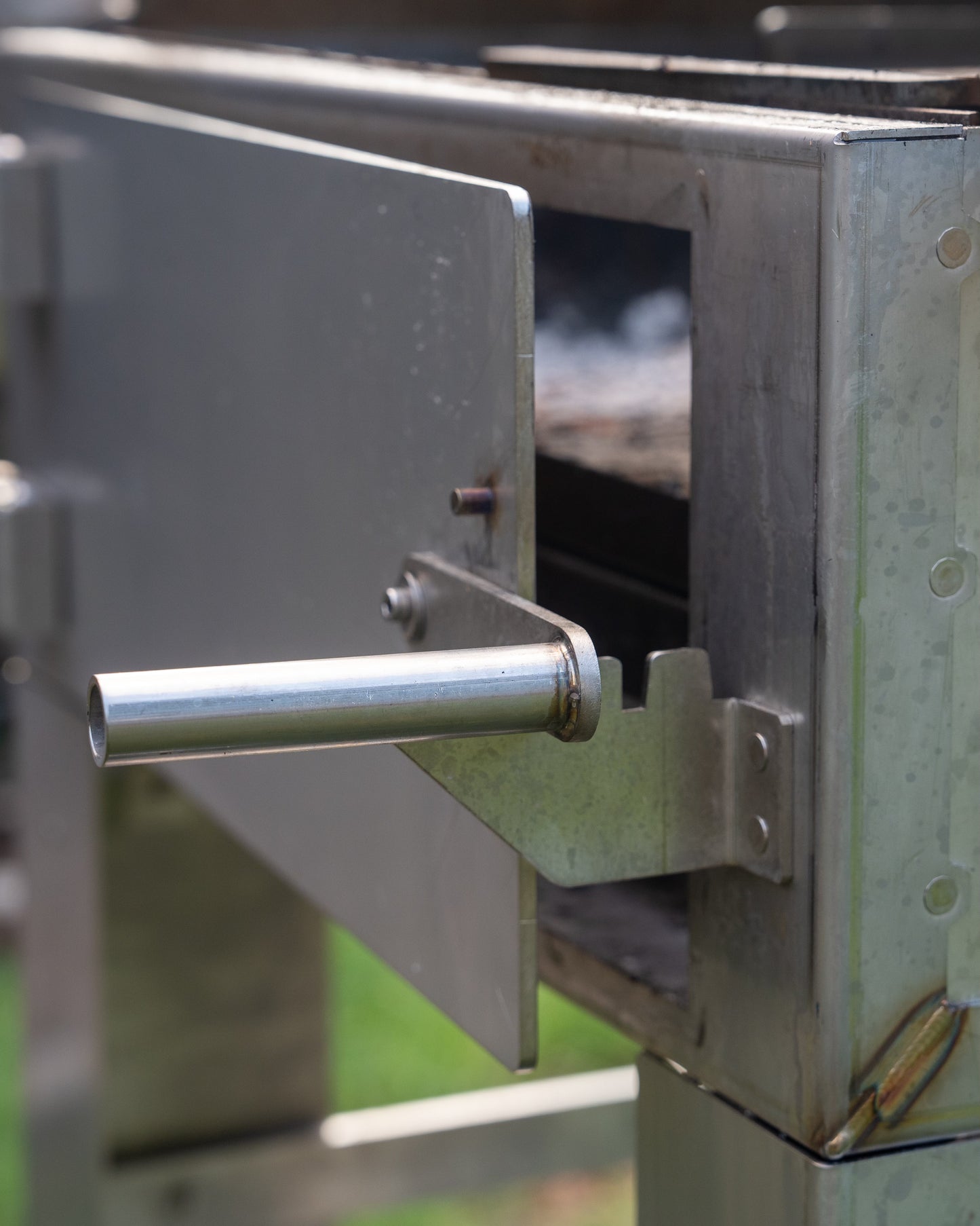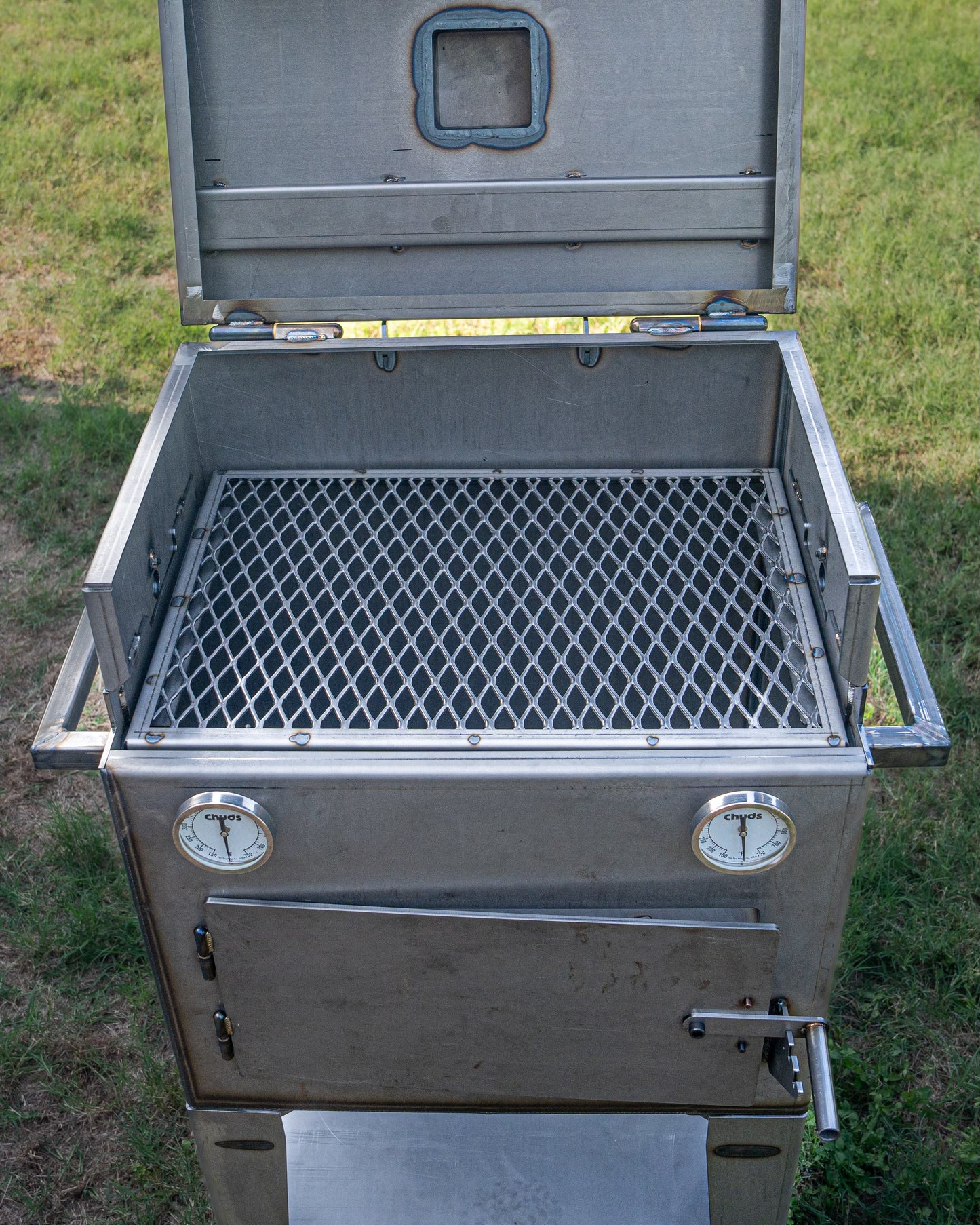 The Chud Grill is one of the most versatile grills on the market, with a front door for charcoal access and airflow, two side vents and two pin wheel vents on the lid. All external parts are made of 14-gauge 304 stainless steel so it won't rust and because stainless steel retains heat longer than carbon steel, we were able to use thinner material without sacrificing quality.