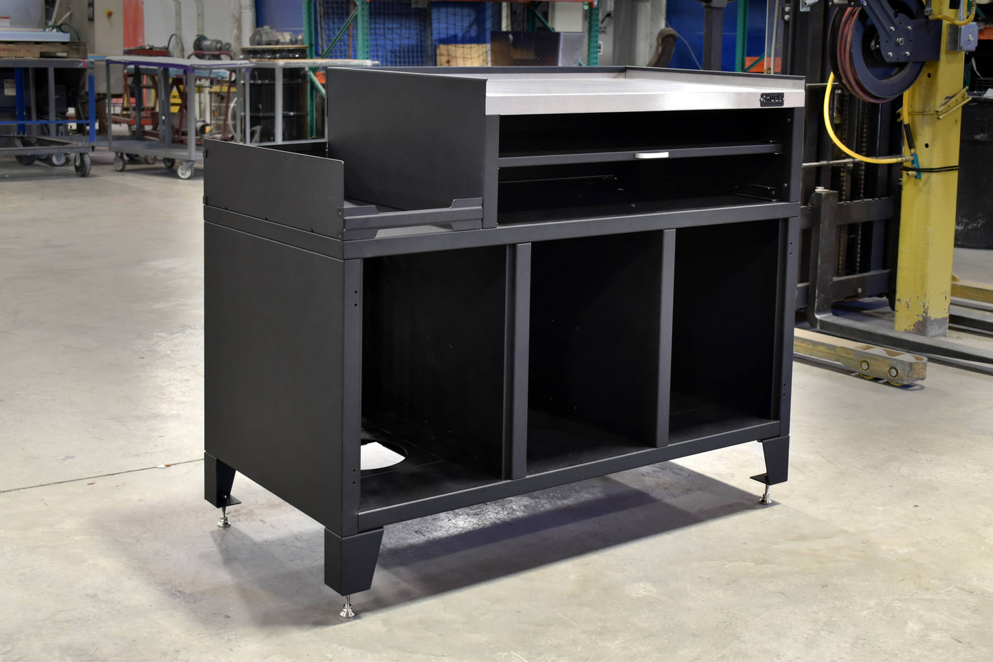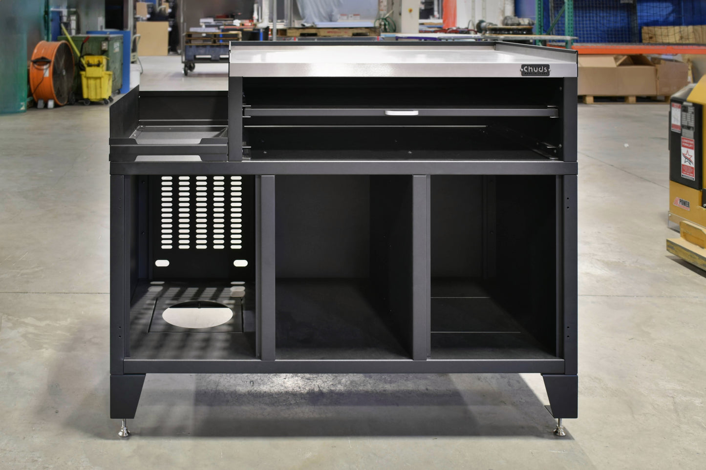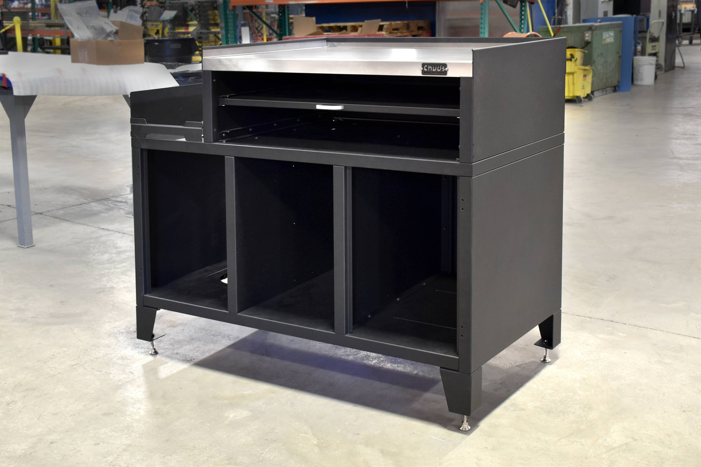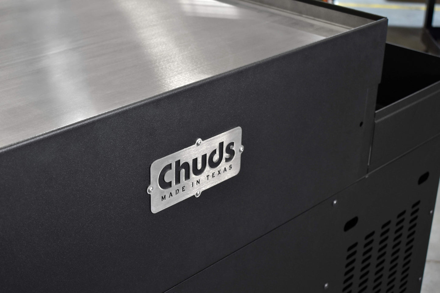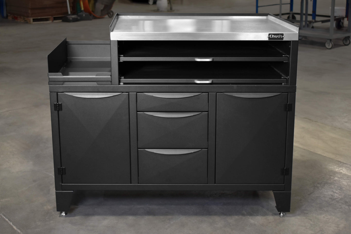 The Chud Table is the perfect outdoor cooking surface. With a black powder-coated aluminum body and a stainless steel prep surface, it's light and easy to move and clean. It uses leveling feet so you can make sure it's always level, or fits standard 4" casters.