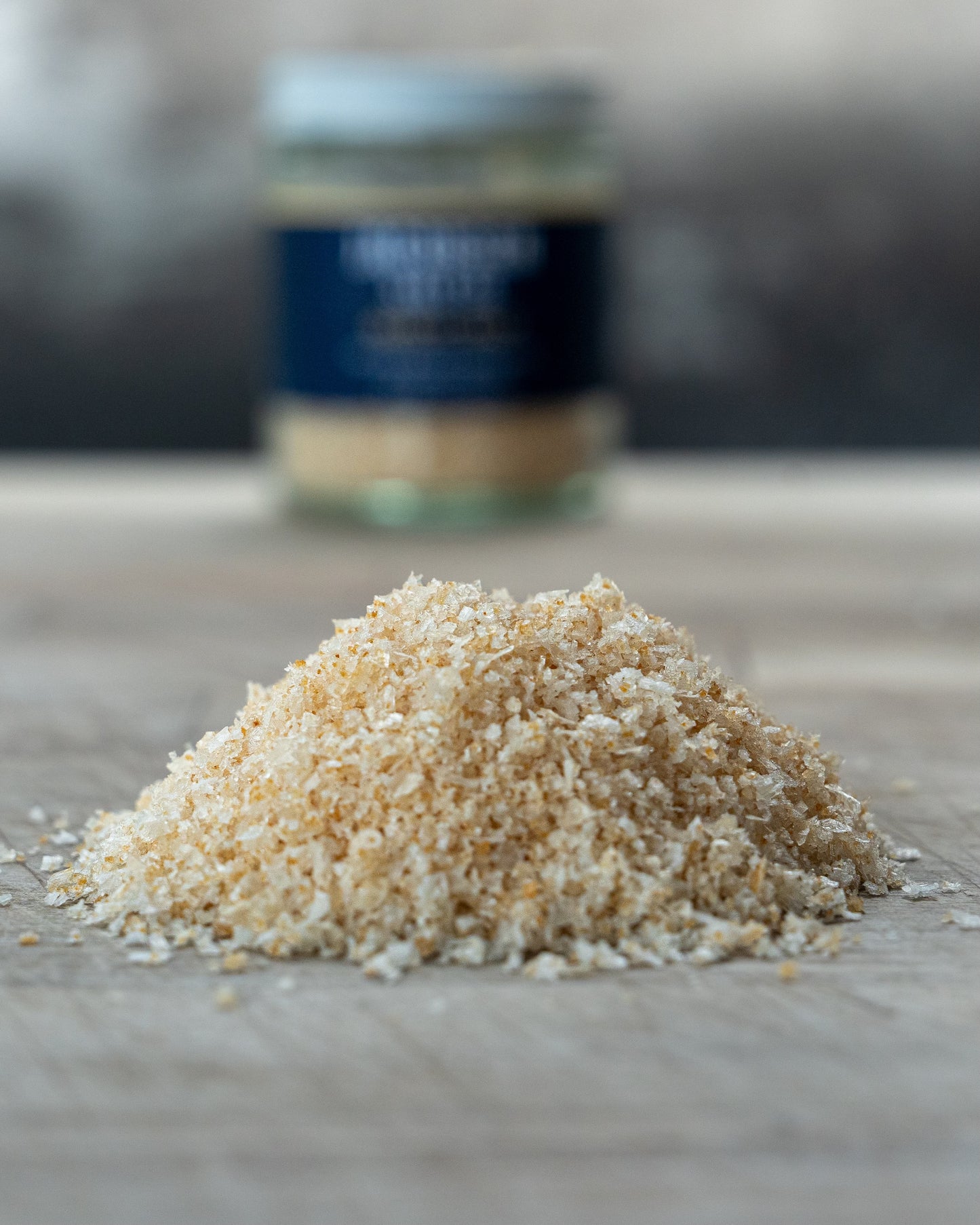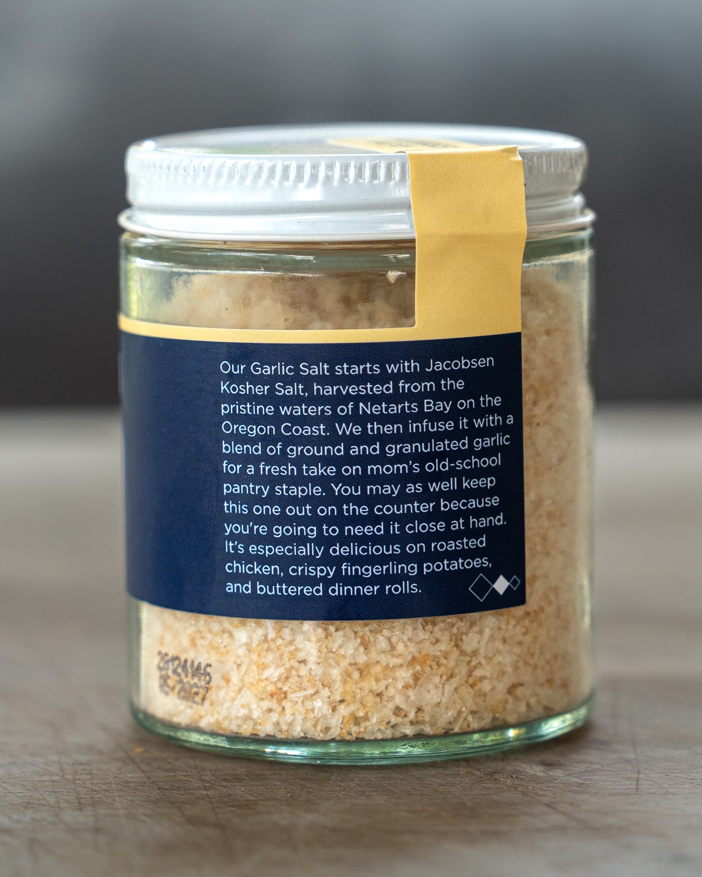 This finishing salt uses high-quality kosher sea salt harvested from the pristine waters of Netarts Bay on the Oregon Coast, then infused with ground and granulated garlic. It adds crunch and flavor to cooked food or veggies.
